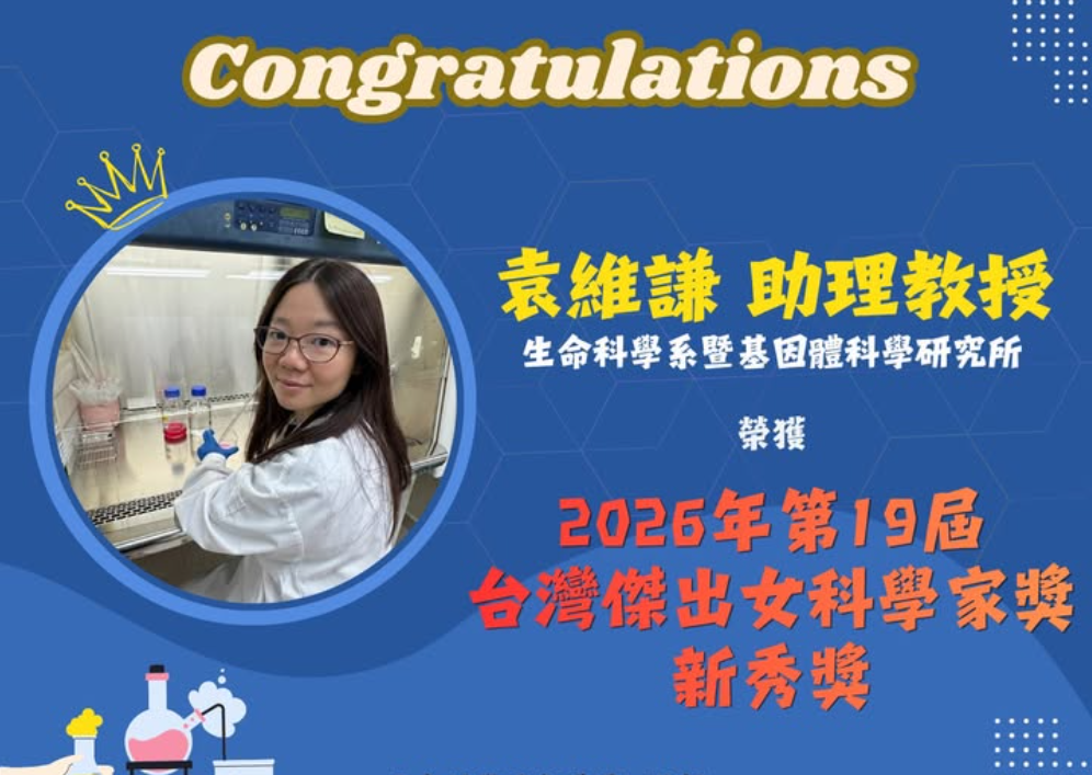 為表揚女科學家的傑出成就及對社會的貢獻而設立的「全球傑出女科學家獎」,於今日揭曉2026年第19屆「台灣傑出女科學家獎」得主。生命科學系暨基因體科學研究所 袁維謙助理教授 以優異的研究表現,榮獲「新秀獎」的肯定,恭喜袁維謙老師!